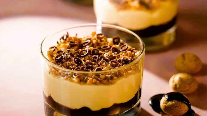 Coppa Mascarpone is an irresistible fusion of rich flavors and velvety textures. Indulge in layers of luscious chocolate, followed by a silky smooth mascarpone cream, all crowned with crunchy Amaretto cookie crumbs and delicate shavings of fine chocolate, a true treat for any dessert lover.