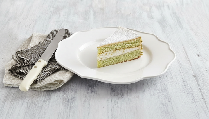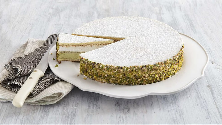 This elegant Ricotta & Pistachio Cake is an airy sponge cake paired with pistachio and ricotta cream filling. A garnish of crushed pistachios and powdered sugar provides both visual appeal and authentic flavor. Weighing 2 lbs. 6.8 oz, this dessert serves 12 and requires 8 hours of refrigeration to properly thaw before presentation.